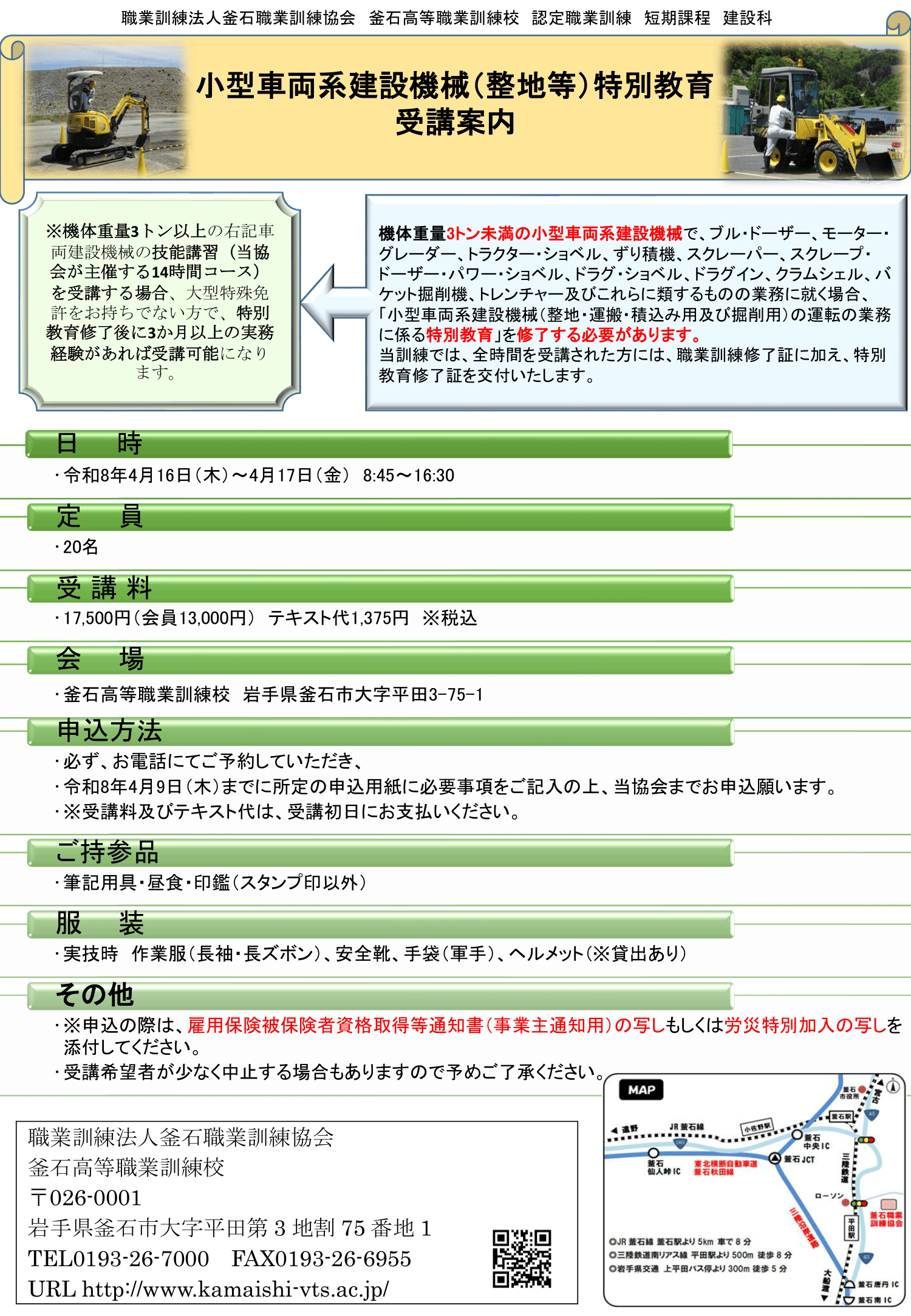 お申込み・問合せ先:釜石職業訓練協会 電話:0193-26-7000 FAX:0193-26-6955