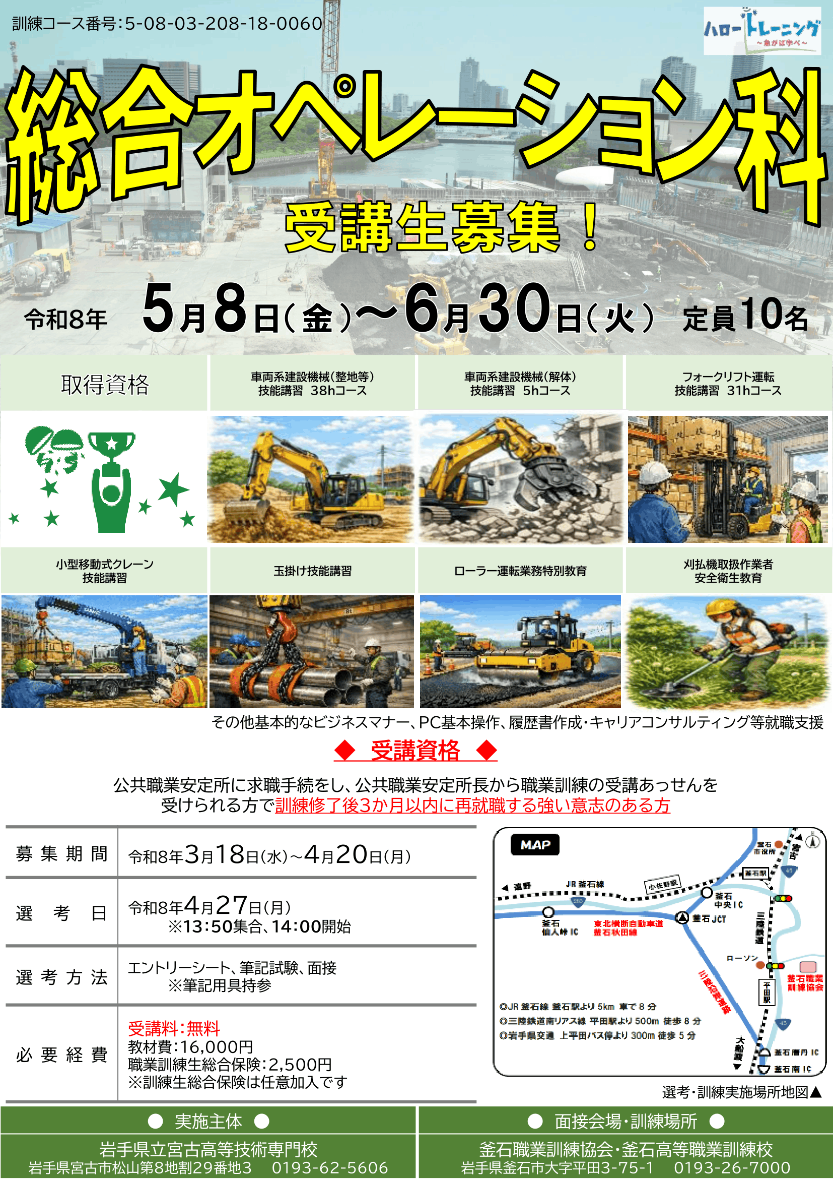 お問合せ:(応募について)最寄りのハローワーク・(訓練内容)釜石職業訓練協会tel:0193-26-7000