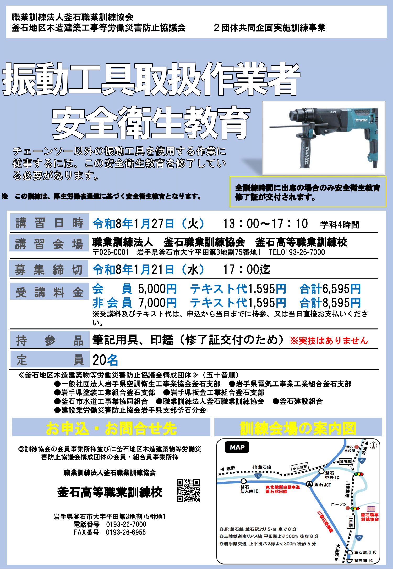 お申込み・問合せ:釜石職業訓練協会 TEL:0193-26-7000 FAX:0193-26-6955