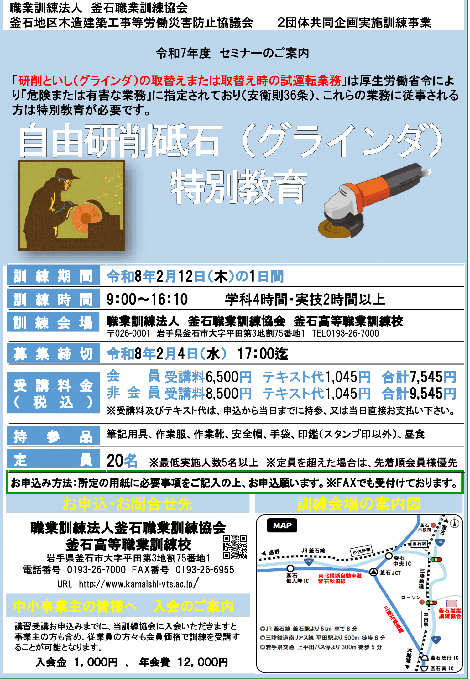 申込・問合せ:釜石職業訓練協会 釜石市大字平田3-75-1