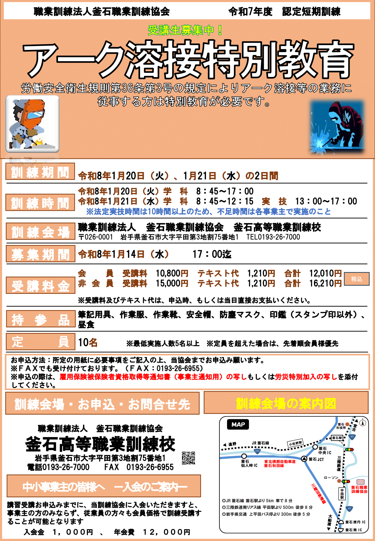 申込・問合せ先:釜石職業訓練協会 TEL:0193-26-7000 FAX:0193-26-6955