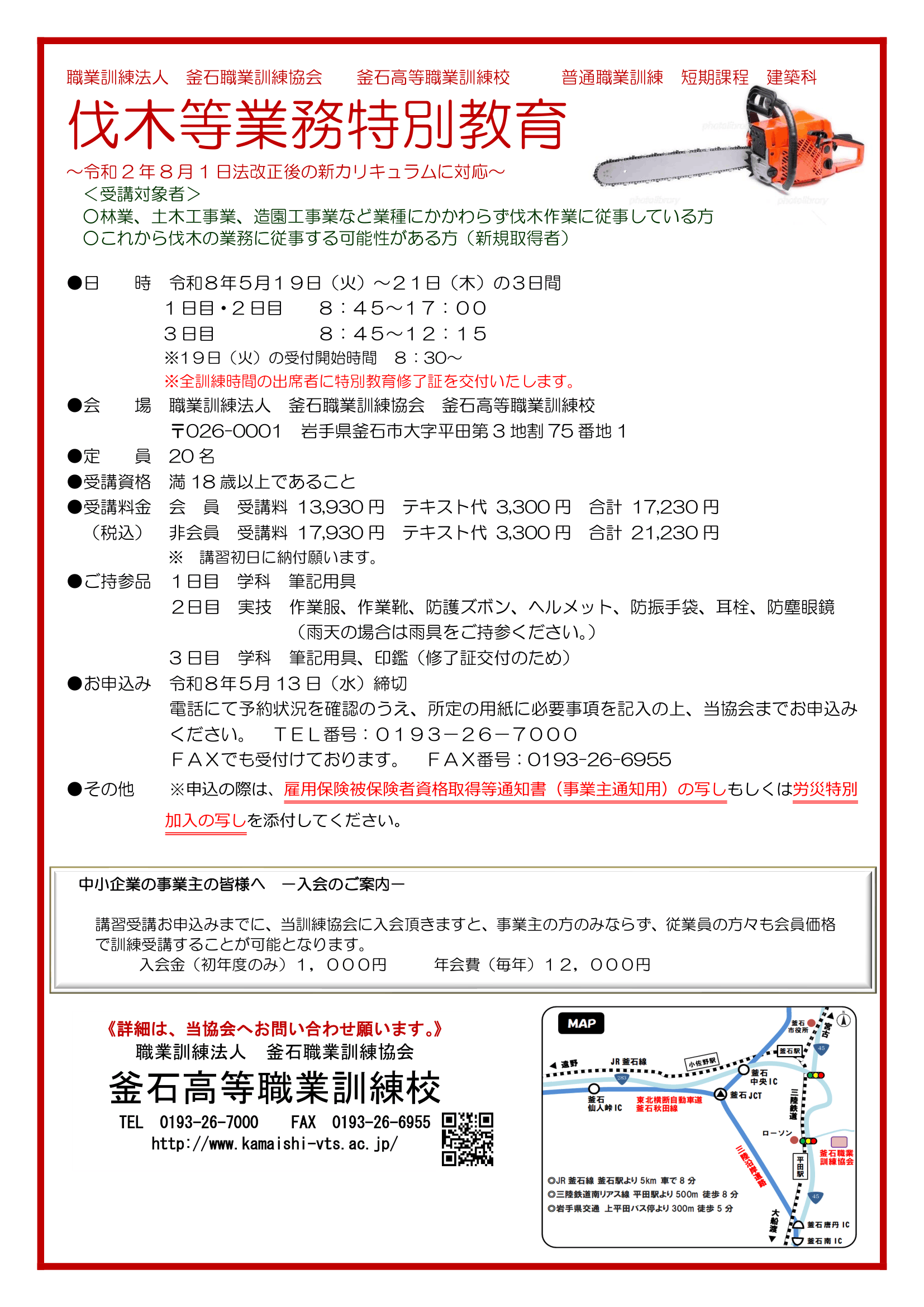 会 場:職業訓練法人 釜石職業訓練協会 〒026-0001 岩手県釜石市大字平田3-75-1