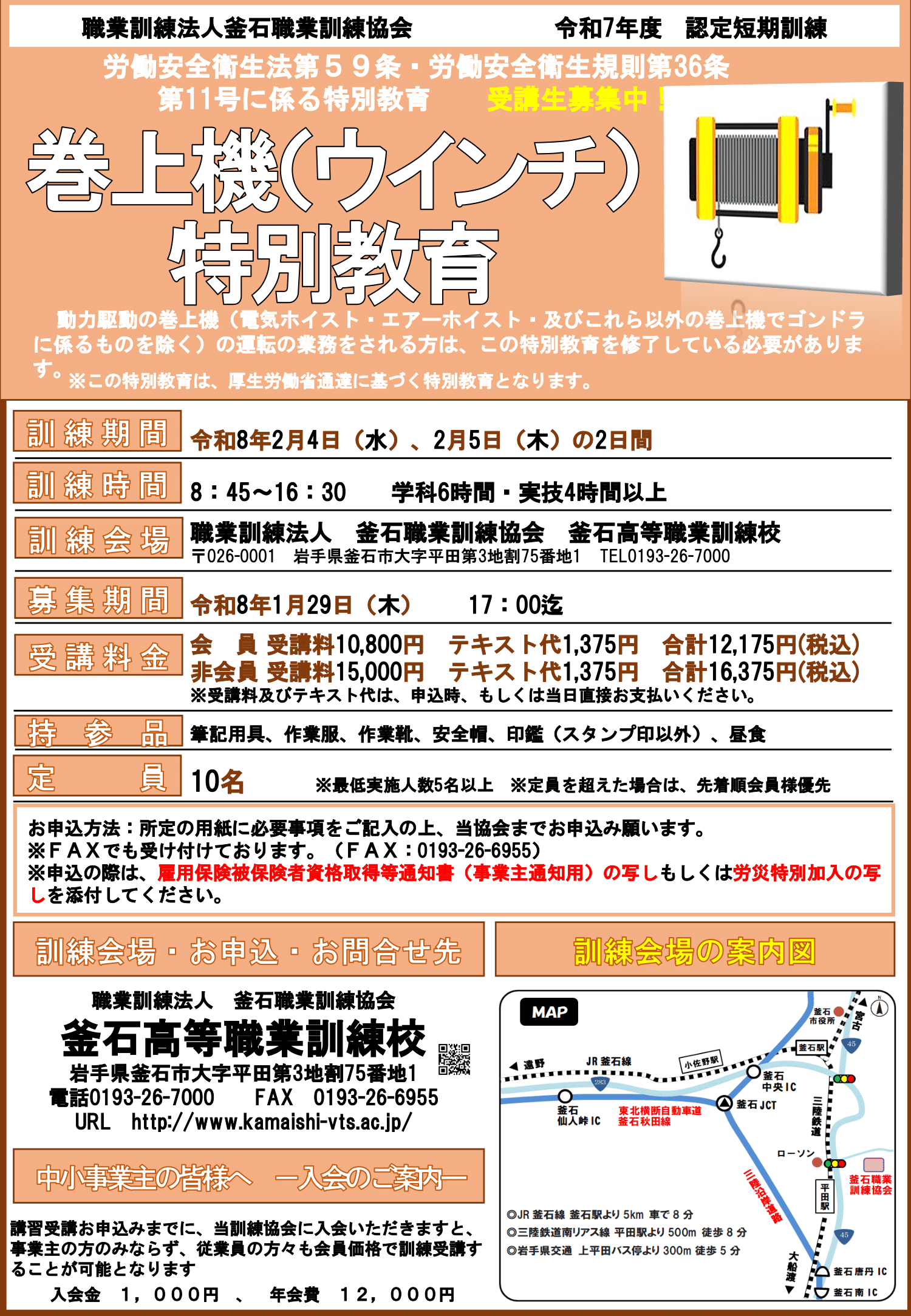 訓練会場・申込・問合せ先:釜石職業訓練協会 岩手県釜石市大字平田3-75-1