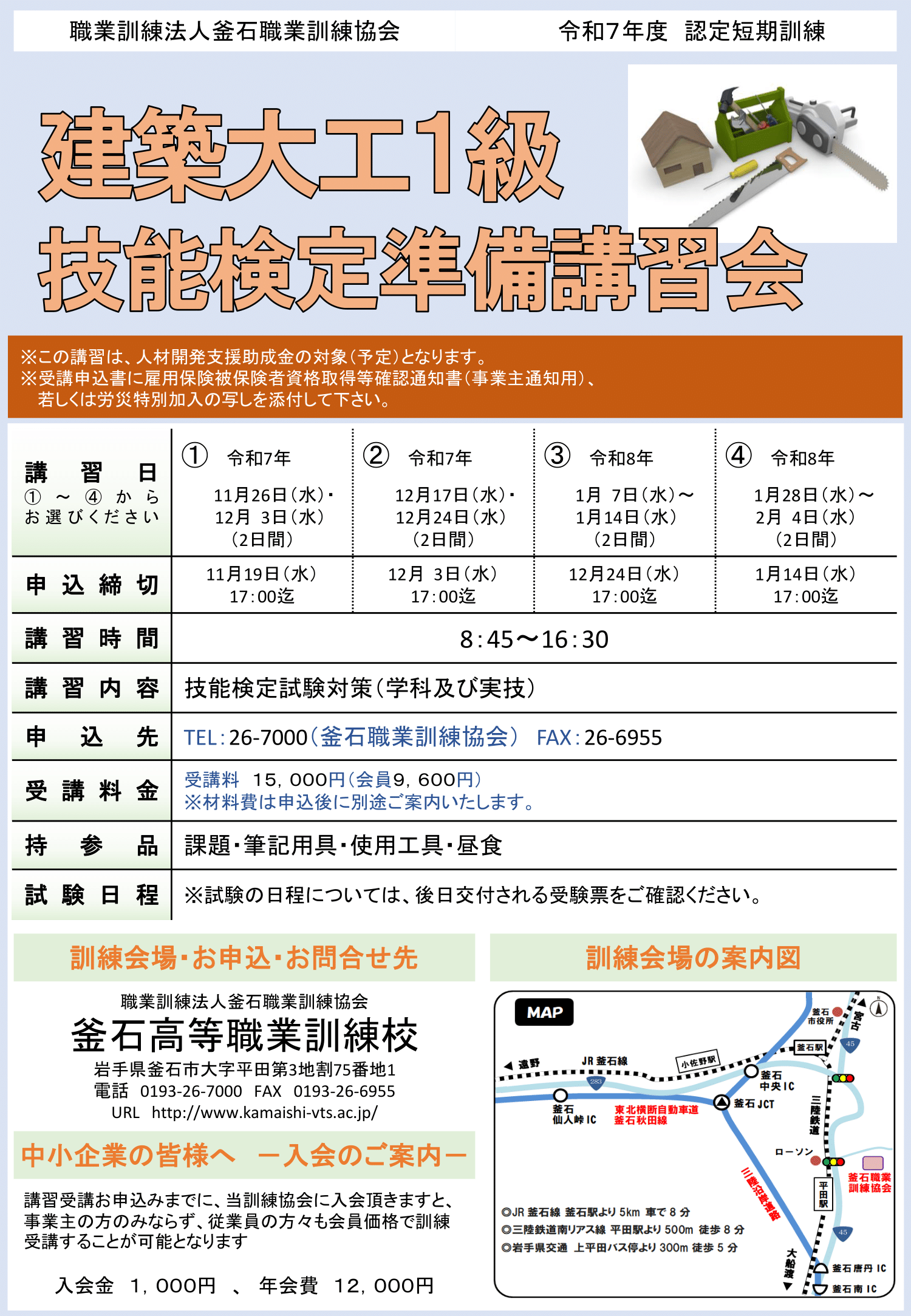 申込先・訓練会場:(職)釜石職業訓練協会 釜石高等職業訓練校(TEL:0193-26-7000 FAX:26-6955)